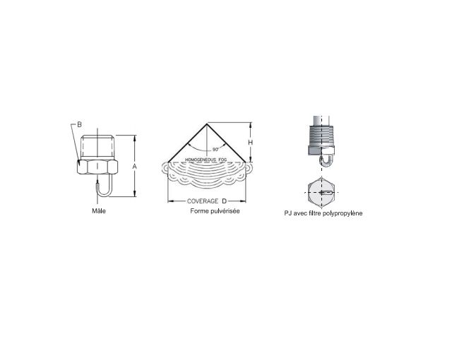 DESIGN FEATURES • High energy efficiency • One-piece, compact construction • No whirl vanes or internal parts • 1/8” or 1/4” male connection • 100-mesh screen, 20 micron paper filter or 70 micron polypropylene filter optional • Optional welded pin and optional safety wire hole SPRAY CHARACTERISTICS • Finest fog of any direct pressure nozzle Spray pattern: Cone-shaped Fog Spray angle: 90°. For best 90° pattern operate nozzle at or above 4 bar Flow rates: 0.043 to 5.34 l/min