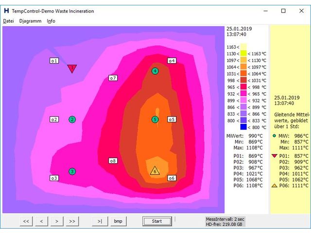 The combination of several thermometers allows a thermography to be performed in the section of the incinerator. This allows precise control of the ammonia injection or the position of the flame.