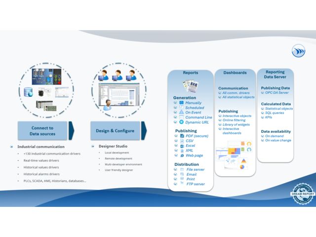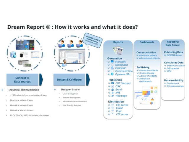 In summary, Dream Report is a comprehensive and scalable solution designed to provide detailed, real-time analysis of industrial data while ensuring seamless integration, great flexibility, and enhanced security. It is the essential tool for companies looking to optimize decision-making and meet the challenges of modern industry.