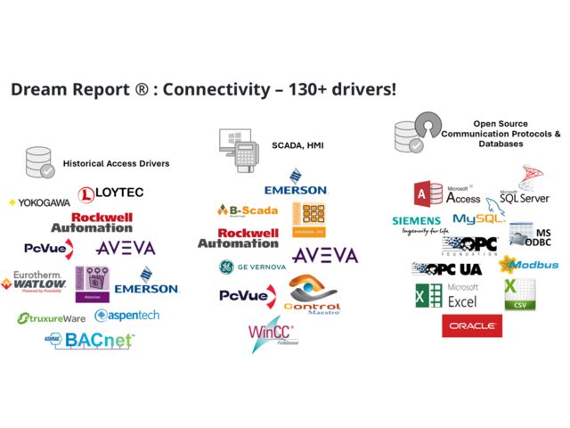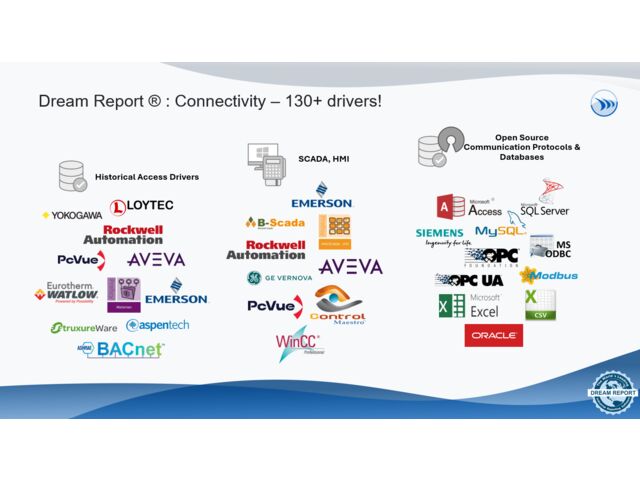 • Extensive Industrial Connectivity: Dream Report connects to over 130 industrial drivers, ensuring effective communication with various systems such as PLCs, SCADA, HMIs, historians, and databases. This wealth of connectors guarantees optimal integration of data from multiple sources.