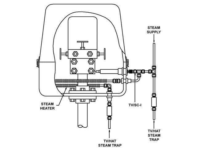 The TV/SC-I (Tube Valve/Steam Control Instrument Enclosure) valve is installed into the wall of the enclosure so that the thermal actuator end is inside to sense the ambient temperature. The thermostatic wax actuator regulates the steam supply to the heater to accurately maintain the desired temperature, operating like a thermostat in an oven.
