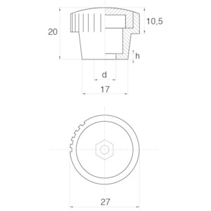 Make your knob yourself with Plastimont bodies ! Insert hex screw or nut made of steel, stainless steel, brass, nylon or other material. Housing designed for hex head screws or nuts : ISO 4032, DIN 571, DIN 931, DIN 933, DIN 934, DIN 1587, NFE 24-017, NFE 24-032, NFE 27-311, ISO 4017... Usable screw length once assembly is made = screw length minus “h”. Example of assembly with a screw M5 x 20 mm : usable screw length = 20 mm - 2 mm = 18 mm.