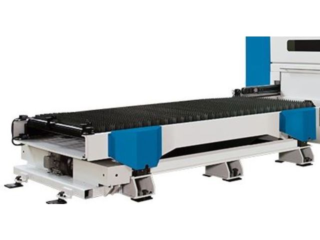 Automatic change table system with electric height adjustment minimizes down-times; table can be loaded and unloaded during the cutting process
