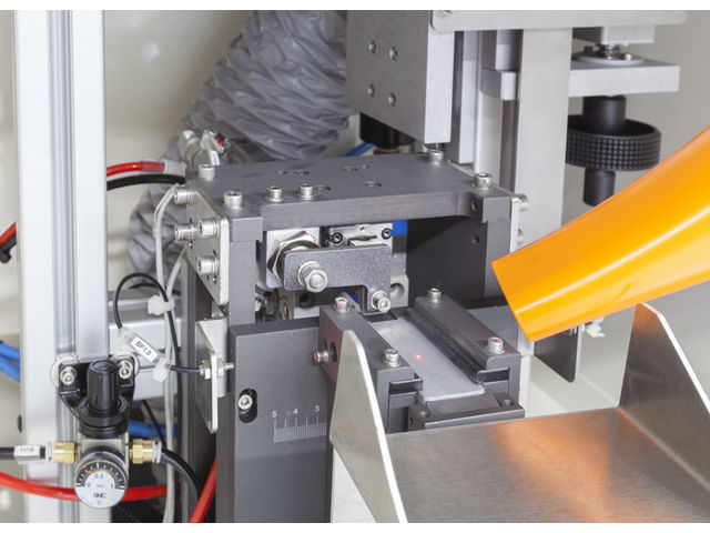 A piston pushes the stack, which has been placed between two fixed and regulated supports in order to be at the proper focal distance, and begins marking. Each time the laser engraver finishes marking a tag, another piston pushes the tag out. The tag is released into a specific conveyor or into an optional stacker in order to maintain the same print sequence.