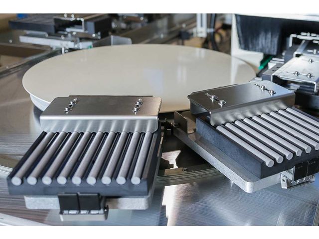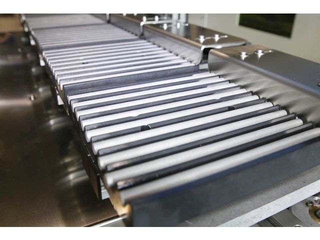 Cylindrical parts are loaded quickly into the fixture with varying diameters and the pallets move around in a loop to be marked and unloaded. The marking area has a built in stop to index the pallet which consistently produces accurate, precise, repeatable marks. The programmable and motorized Z axis controlled from a PC provides for automatic marking on the same pallet with parts that have varying heights. Once the marking is completed, it can be downloaded automatically with a rollover system. The line speed is then adjusted by an inverter.