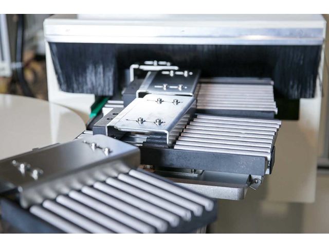 The system can be installed with different types of lasers according to the material to be marked and a vision system can be integrated. The operator loads the pieces on the several pallets and he starts the cycle: the first pallet – and then all the other pallets in a continuous loop – is transported in the marking chamber to be indexed and marked. The pallet with the marked pieces is then released and it passes into the automatic discharge station where it is overturned and the marked pieces run on a specific slide while the empty pallet returns to the loading station. The system is available with a full range of laser systems depending on the material to be marked.