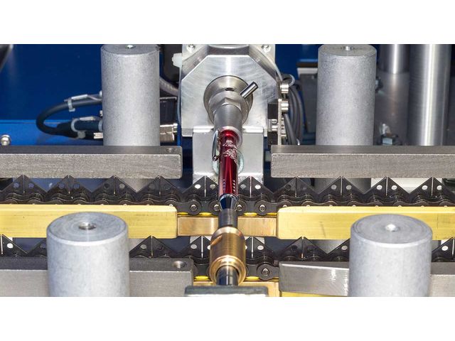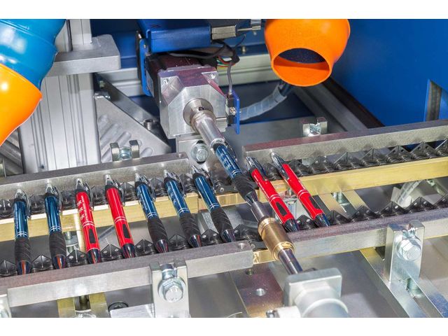 This revolutionary marking system reduces operator time to load and unload pens into a rotary device speeding up production. The first zone of the system aligns and orients the pen in the same direction. The pen travels along and is then rotated 360 degrees to wrap information around the circumference.