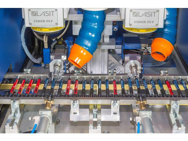 The Lasit Automated Pen Feeder marking system is designed for laser marking pens or other cylindrical parts (barrels) automatically. This high speed system provides hours of use unattended by placing a large volume of pens into a hopper and then having them come out the other end fully marked. The system orientates and then rotates each pen and logos, text can be marked in a linear fashion or wrapped around the circumference of the pen (or cylindrical part).