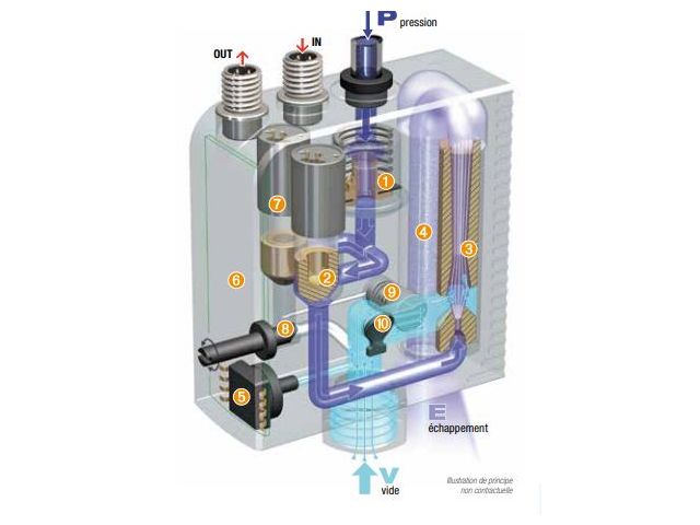 “ ASC: For airtight or semi-airtight products, the LEMAX+ pumps automatically run above"ASC" cycle, thus resulting in maximum energy savings (90%), according to the following three phases: 1-Product gripping: Vacuum generated by the venturi. 2-Operations on vacuum gripped product: At the L2 vacuum threshold (75%), incoming air pressure is blocked, consumption becomes zero; the product remains gripped due to the non-return valve. If micro-leaks make the vacuum drop to the L2 threshold - the value of regulated hysteresis), vacuum generation is briefly resumed. 3-Product release: By externally controlled blow-off or automatic blow-off function. ”