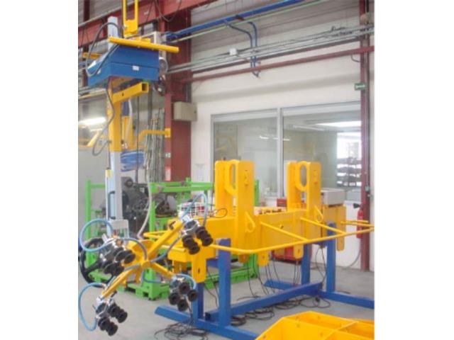 Being characterized by a variable radius of curvature, this lifting beams allows the reversal of collections spray-painted in 180 ° thanks to a crown of orientation of the lifting beams. Endowed with a structure in the shape of key to balance the load, this lifting beams are equipped with 3 suction cups for adaptation to the various curvatures.