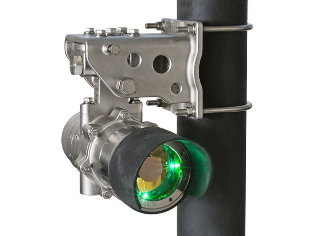 The system consists of two stainless steel modules — a transmitter and a receiver, along with mounting fixture hardware. Both modules are powered from an external 24 volt DC supply. The receiver provides the measurement signal outputs, and is furnished with onboard “status indication” LEDs and an internal magnetic calibration switch. The transmitter houses a high quality xenon flash lamp.