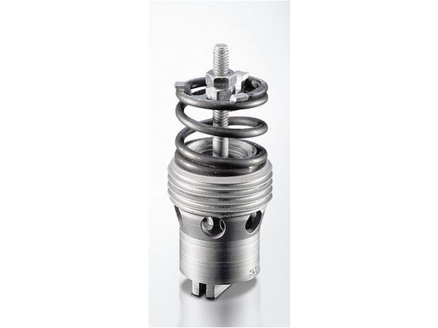 When the flow through the valve increases above the pre-set limit, the flow forces will exceed the opposing spring force and the valve will block the flow immediately. The valve element in these valves is a shim. There are two different versions available. One valve design completely blocks the flow when actuated, whereas the other one allows a minimum flow (via an orifice) to slowly drop the load.