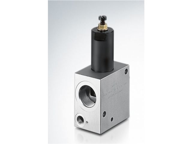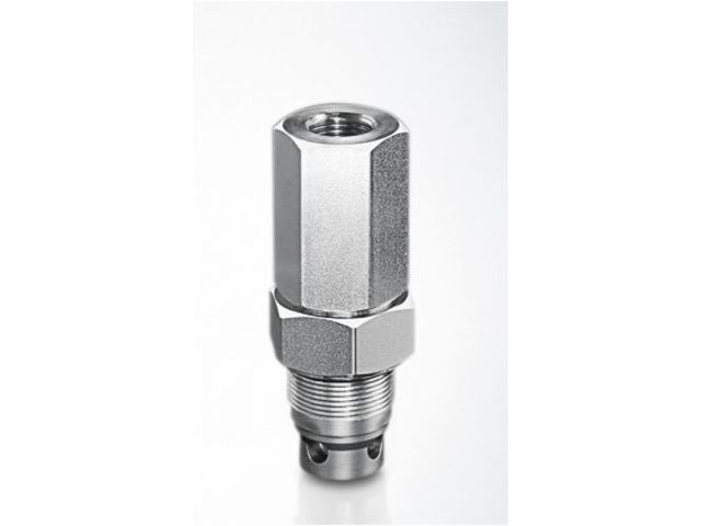Load holding valves are pressure valves, which act always on the return flow side of double acting consumers. They block the return duct according to their set pressure (setting approx. 15% above the max. load pressure) generating a counter force to a pushing (negative) load. Therefore the pump will have to feed the inflow side, e.g. pressurizing the cylinder enough to overcome the set pressure of the load holding valve, there by dropping the load. Type LHK is intended for applications which are hardly prone for oscillations.
