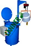 The operating drum is lifted into the centrifuge over the cross beam. Once the drum is placed in the centrifuge, the individually programmable spin cycle starts. At the end of the spin cycle the drum with the centrifuged contents is removed and the spin process is repeated with the wet material.