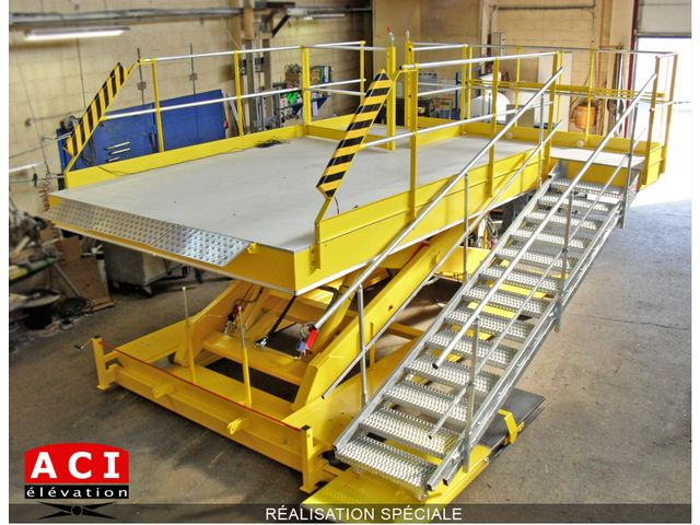 Used to load and unload vehicles by pedestrian or fork lift trucks without a loading deck. Designed to operate with maximum safety for off-centred crossing loads. Safety tread top platform surface. Max. 15 cycles per hour, one shift a day. Upper limit switch. Check valve on each cylinder for higher stability. Self lubricating bushings on pivot points. Hydraulic power pack inside the table provided with relief valve against overloading and compensated flow valve for controlled lowering speed. Electric equipment controlled by electronic system, with transformer and thermal protection. Wide range of option available such us wheel stop, goal post, safety handrails, manual bridge plate.