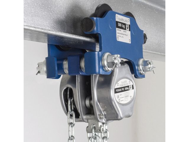 The very best manual chain hoist PLS PREMIUM and a trolley LST-H are put together in an integrated combination to save headroom. That means the distance between load point of hook and bottom of beam flange. This is very important if rooms are low or space is narrow. Halls can be build smaller what saves costs. Or if the clearance in older buildings is too narrow for standard hoists – this is the solution!