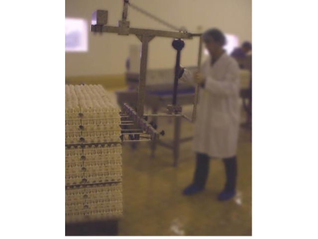 The manipulator of trays of eggs is equipped with a system of prehension with forks allowing the manipulation of 4 piles of eggs in a cycle. Of a 48 kg capacity, the manipulator assures a cadence of 180 cycles / hour.