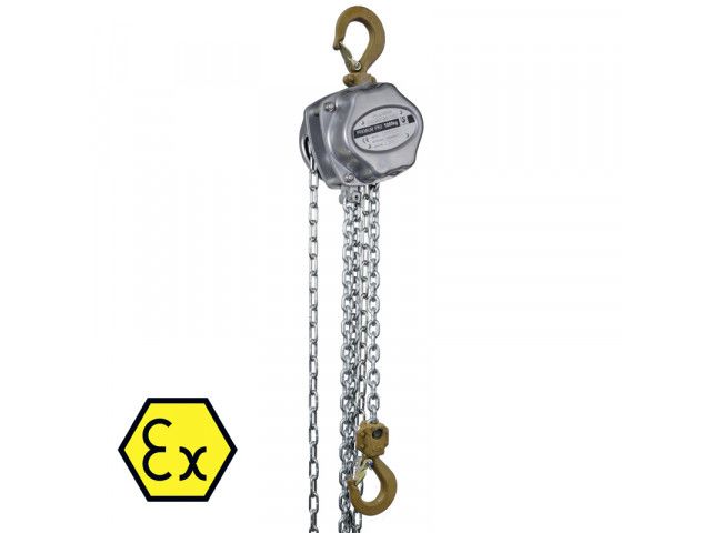 Mud and dirt cannot harm this hoist! This protection begins with selflocking galvanized castle nuts, goes over bronze wheels and rustfree chains and ends with fully chromated housing parts. Overload protection in 500 kg capacity hoist and bigger, supplied with ATEX-Certificate!