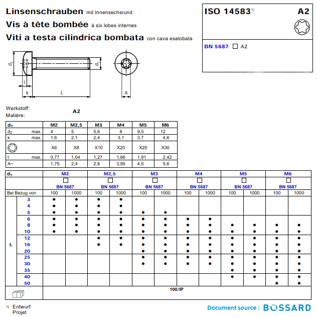 Metal Screws : Round Head - Tête Cylindrique Bombée Large Empreinte Torx - TCBL Torx Inox A2 ISO 14583