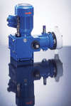 Piston-diaphragm metering pump model FKM with dosing output from 0-0.8 up to 0-3,072 l/h, and designed as single or twin head pump. Linear and continuous adjustment of the output in the range of 0-100% while the pump is on duty or out of operation. Available materials for wetted parts are: PVC, PP, PVDF, SS 316 Ti and steel-encased plastics. All metering pumps of this type include a pressure relief valve according to DIN EN 809 and are also available with alarm sensors. Zero point is infinitely adjustable.