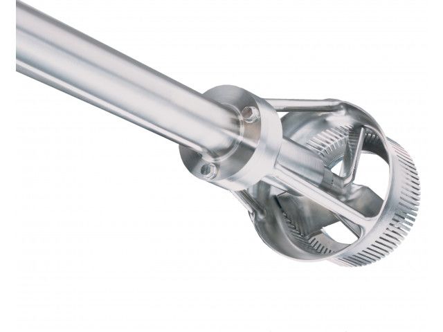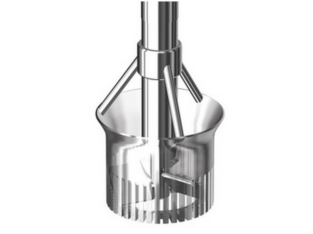 The Dispermix head generates two differently directed liquid streams. A vertical partial flow is directed straight to the vessel bottom, where it is divided and circulates the entire vessel contents. A second partial stream is deflected horizontally in the Dispermix head and guided through the dispersion zone. Solid particles and/or droplets are reliably comminuted and homogeneously distributed.