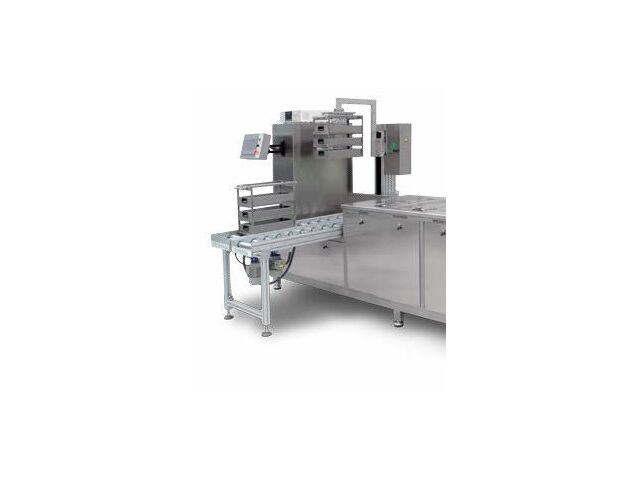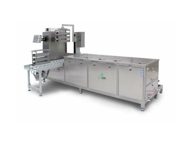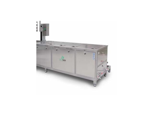 The model shown is a standardised system composed of an ultrasonic cleaning system, two cold rinsers, one hot rinser and a dryer.