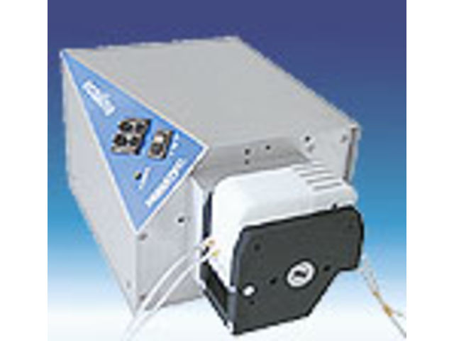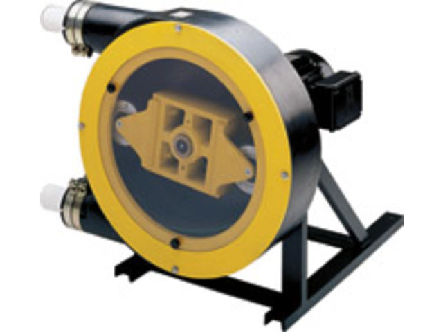 Positive displacement, self priming, dosing, peristaltic pumps for medium pressures. Two rollers on a rotor compress alternating with each other a thick-walled hose in a patented concentric guide and push on account of the rotation the content of the hose (the pumped liquid) from the suction to the discharge side. Through the subsequent opening of the hose a vacuum on the suction side is created by which a continuous aspiration results. For sizes N1-N4, the rotor is supported by oversized ball bearings located inside the pump casing, while for sizes N5-N10 it is supported by the heavy duty bearings of the flanged geared reducer. The hose could be either extruded or nylon fiber or steel reinforced. All the pumps can be supplied in monobloc execution, fitted with geared motors, variable speed motors, electric, diesel, pneumatic or hydraulic motors; special executions with V-belt. Capacity and speed variation by means of pneumatic signal (3-15 psi) or electronic signal (4-20 mA) with built-in inverter.