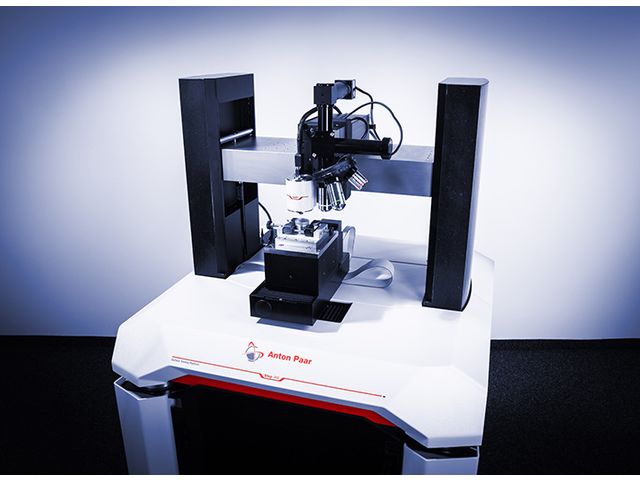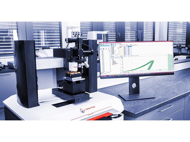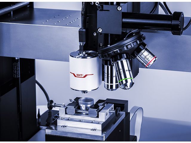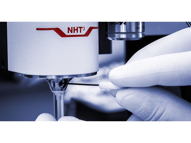 “ Straightforward nanoindentation measurements With Anton Paar’s intuitive software you can easily define and analyze each type of instrumented indentation measurement, from standard to highly advanced methods. The integrated microscope offers a very large magnification range so you can observe the sample’s surface and allows you to directly define the measuring position. Moreover, the indenter is fully protected from collision by the reference ring and the exchange of a measuring tip can be done in less than 2 minutes. High accuracy and short time to measure The unique design of the instrument integrates a top surface reference ring that follows the sample’s surface throughout the indentation measurement. This means the indentation depth is always directly measured with respect to the current surface position. Anton Paar’s nanoindentation tester is the only instrument with this unique feature, meaning NHT³ delivers accurate results and not error-prone software corrections. A further advantage of this technique is that you can immediately start your measurement after the sample installation without waiting hours for thermal stabilization. High throughput with quick matrices The fast measuring mode allows you to perform up to 600 measurements per hour with real indentation curves. Thanks to our referencing design, no thermal stabilization is needed, which allows you to install and immediately measure a high number of samples per day. With its user profiles, measurement protocols, multi-sample measurements, and customizable reporting, NHT³ has the highest throughput on the market. Additional dynamic mechanical analysis (DMA) with “Sinus Mode” Sinus Mode enables you to perform DMA analysis in order to study the evolution of mechanical properties over depth (HIT, EIT vs. depth) and characterize the sample’s viscoelastic properties (E', E'': storage and loss moduli, tan ?). Sinus Mode offers additional features, such as quick indenter calibration and stress-strain analysis. ”