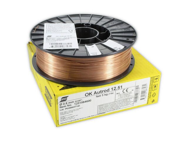 A copper coated, G3Si1/ER70S-6 solid wire for GMAW of all general structural and engineering unalloyed and low-alloyed carbon-manganese steels. The electrode may be welded with either a gas mixture or with pure CO2 as the shielding gas. OK Autrod 12.51 delivered in the unique Esab Octagonal Marathon Pac is an excellent choice in mechanised welding applications