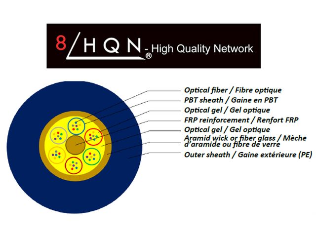 There is an FRP reinforcement at the center of the cable. The PBT sheaths that maintain the fibers are filled with gel and are stranded around the FRP reinforcement. The sheaths are surrounded by a layer of aramid. Then the cable is completed by a polythene sheath.