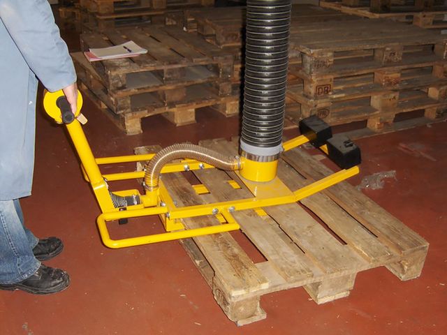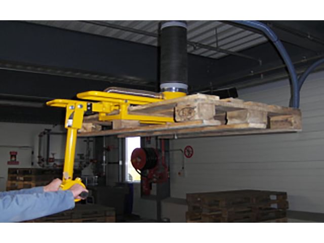 vacuum lifting technology with a lifting tube equipped with a pallet fork, the system enables efficient handling of pallets of various sizes and configurations, with a lifting capacity of up to