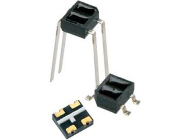 Photo reflectors consist of one infrared LED and a phototransistor. Unlike photo interrupters, these are mounted side by side within one package. Should an object be above the sensor, the light emitted by the LED will be reflected and scattered back to the phototransistor. The amount of light scattered back is strongly dependent upon the reflected material and the distance between the sensor and the reflecting surface. It is therfore necessary to consider operational conditions, tolerances and disturbing light influence when designing the circuit. The photo reflectors with lenses permit a higher lateral resolution.