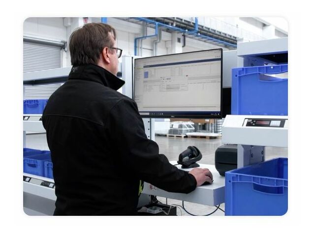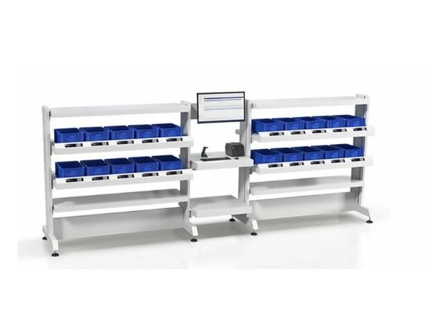 This is a fixed, complete and modular picking station, equipped with various picking positions. It is made up of a sturdy coated steel structure, shelves to support the containers and a number of Put to Light displays with the respective control unit/power supply. The modules can be coupled to expand the station for those who need to process multiple orders simultaneously. Intermediate modules are also available for the installation of monitors, label printers, barcode readers or other accessories.