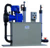 Piston diaphragm metering pump model FKMF for dosing of nearly all liquid chemicals. Dosing output from 48-2400 l/h and 58-2900 l/h and a max. counter pressure of 4 bar. Linear and continuous adjustment of the output in the range of 2% to 100% by the application of an new, powerful frequency controller.