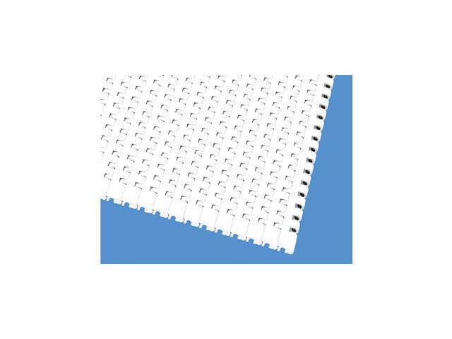 Straight running belts, Pitch 12.7 mm (0.50 in) Belts for medium-duty food and non-food applications Design characteristics Mini pitch belt with small transfer gap robust design guarantees superior durability and high belt pull capacity Design for smooth run on 19 mm (0.75 in) nose bar Headless pin system making it easy to install and remove the belt for maintenance Closed, solid belt edge to prevent belt edge damages Components: Sprockets in different sizes with round or square sprocket bore Detail hinge pin Headless one-piece pin with unique retention system ensures trouble free installation and maintenance
