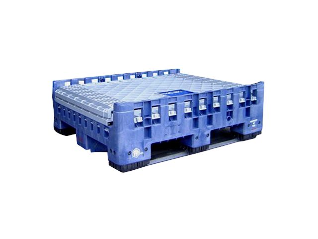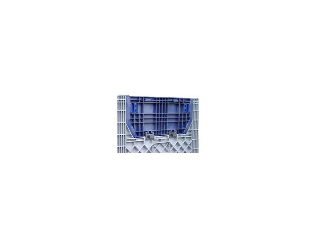 Foldable plastic pallet box ; robust, with static stacking resistance ; static stacking 3/1 and dynamic stacking 2/1.