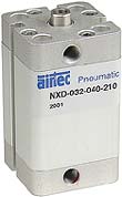 Double acting pneumatic cylinder with permanent magnet for proximity sensors and built-in cushioning rings.