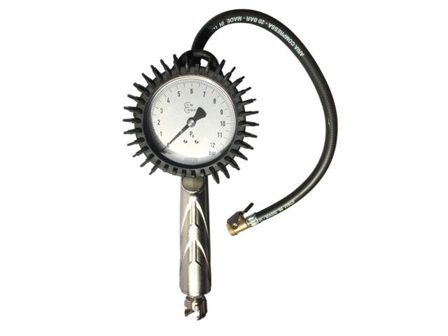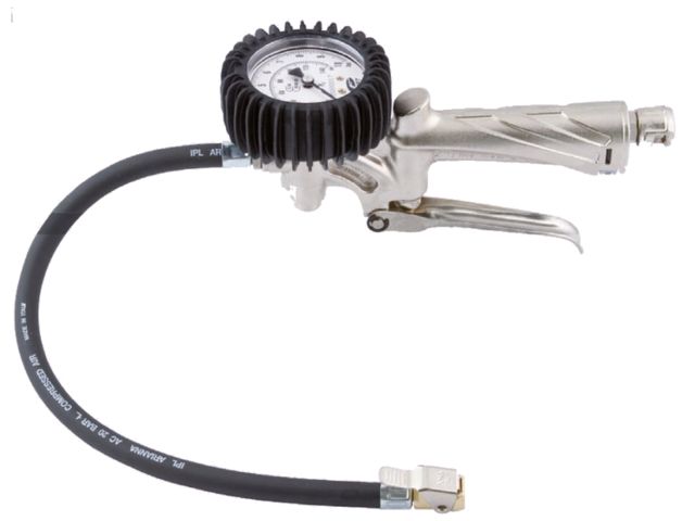 The inflation pistol has a nickel-plated aluminium body and is equipped with an EEC-approved pressure gauge (0-10 bar / 0-140 psi) with a diameter of 60 mm. It also has a two-position lever for inflation and deflation and an overpressure protection.