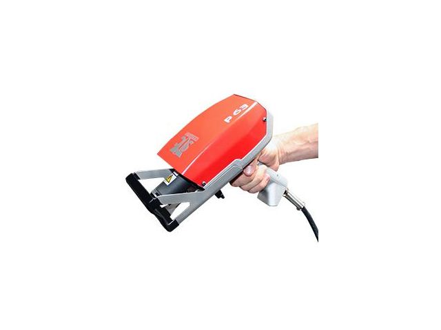 The p63 is a portable, handheld dot peen marker designed for use with the e10 controller. Its lightweight portability makes it ideal for marking large, difficult-to-access parts, and its arched front plate allows for sturdy marking on both flat and cylindrical surfaces. Capable of marking plastics and metals (up to 62HRC), the rugged cast aluminum body, ABS cover, and stainless steel front plate make the p63 a mobile, lightweight, and reliable tool. The marking pin is solenoid actuated and requires minimal maintenance and no air supply system.
