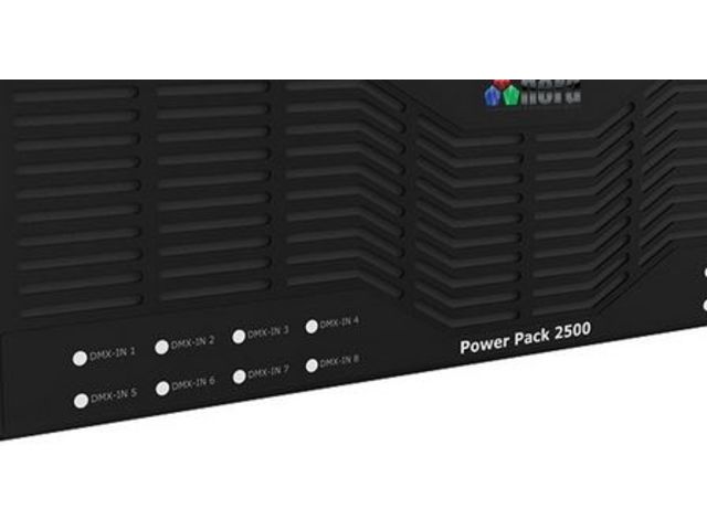 Hera Power Pack® 2500; consists of 8x320Watt power supply unit. DMX signal has been transformed into single connector with power units and exits as 5 Pin Push-Lock. It has 90~264VAC 50/60Hz Universal operating voltage and 8x320 Watt power. It has active PFC.