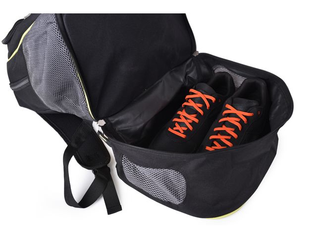 Light, comfortable and resistant, this backpack offers several ventilated compartments and a large storage capacity: 3 interior storage pockets, 2 side pockets and 1 shoe storage compartment (height 13 cm with ventilation system). With its reflective strips, it allows better visibility when it is dark or the place is poorly lit.