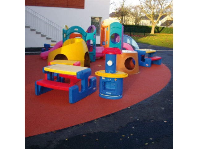 The black granules are used as a damping sub-layer. EDPM granules are used for the finishing coat which is aesthetic and resilient.
