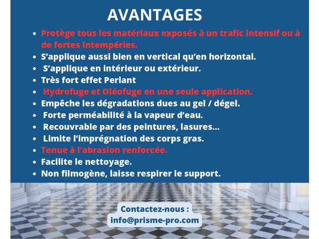 PROTECTEUR SOL EXTRÊME is an ecological product, in aqueous phase (non-toxic, solvent-free and silicone-free). It is intended to provide lasting protection to all porous or non-porous materials against the penetration of water, oil, stains of all kinds or atmospheric pollution. It is therefore particularly effective for treating floors subject to intensive traffic but also the facades of buildings and buildings covered with low-porous materials.