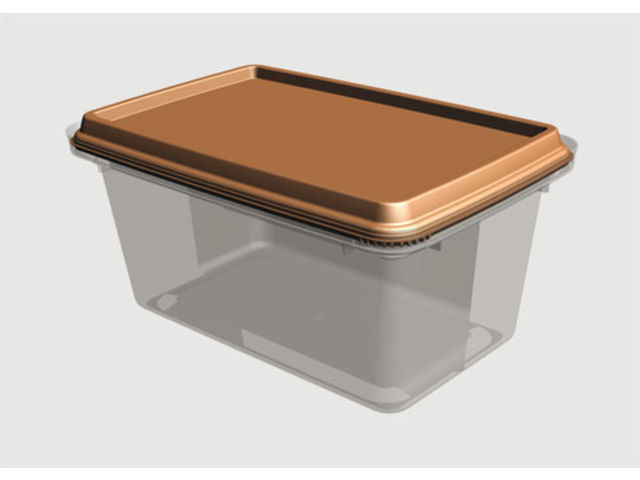Rectangular injected plastic tray with a tamper evident closure. This packaging is well suited for soft margarine, butter, dairy product, dried fruit, veggies, sauce, meat, deli, ready meal, pasta, frozen product, seafood…