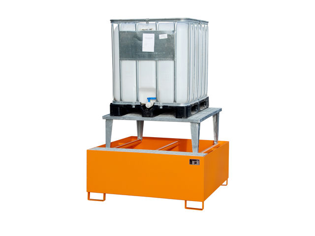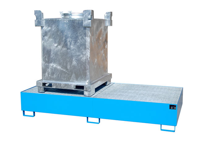 -construction made of 2 mm steel sheeting -spray painted or hot-dip galvanized ??-100 mm ground leeway ??-galvanized grid (load capacity 1000 kg/m²) -Dimensions (l x w x h) in mm: 1200 x 1200 x 410 -Retention capacity in l: 440 -for flammable liquids of the GHS-categories 1-3 and water pollution liquids of the GHS-categories 1-4