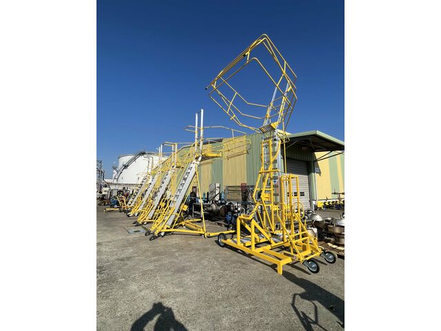 The operator acceeds to the safety cage via an aluminium ladder with rungs. This ladder is height adjustable by means of a winch. The height of the mobile lateral safety ladder is adjustable from 2900 mm to 4500 mm. Access is facilitated by two ramps.
