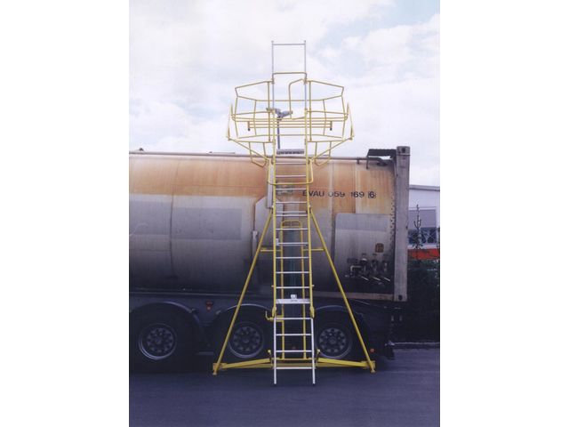 The safety mobile ladder is height adjustable by means of a brake winch crank. The ladder is secured by an anti-fall system that functions thanks to a safety clip. The handrail guarantees complete safety for the user working on the top of the tank.