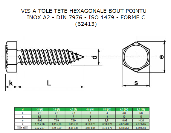 Sheet Metal Screws : Hex Head - Countersunk Head Sheet Metal Screw, A2 Stainless Steel, DIN 7976