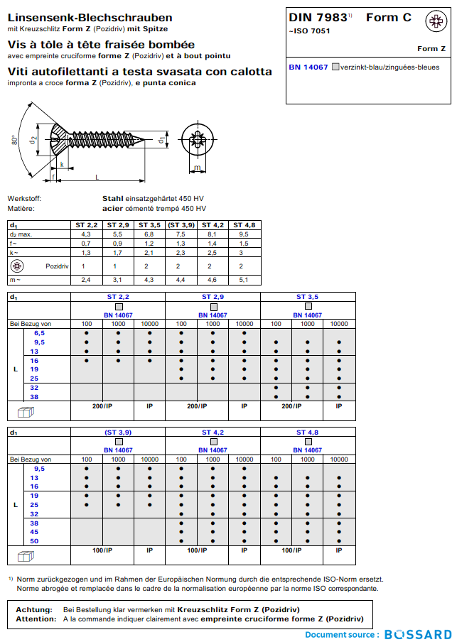 Sheet Metal Screws : Raised Countersunk Pozidriv Head - Raised Countersunk Head Sheet Metal Screw, White Zinc Steel, DIN 7983
