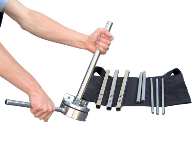 - All of the parts (central part, 3 legs, 3 bars, 3 vertical spindles) can be packed in a bag which can be carried over the shoulder, thus leaving one’s hands free.